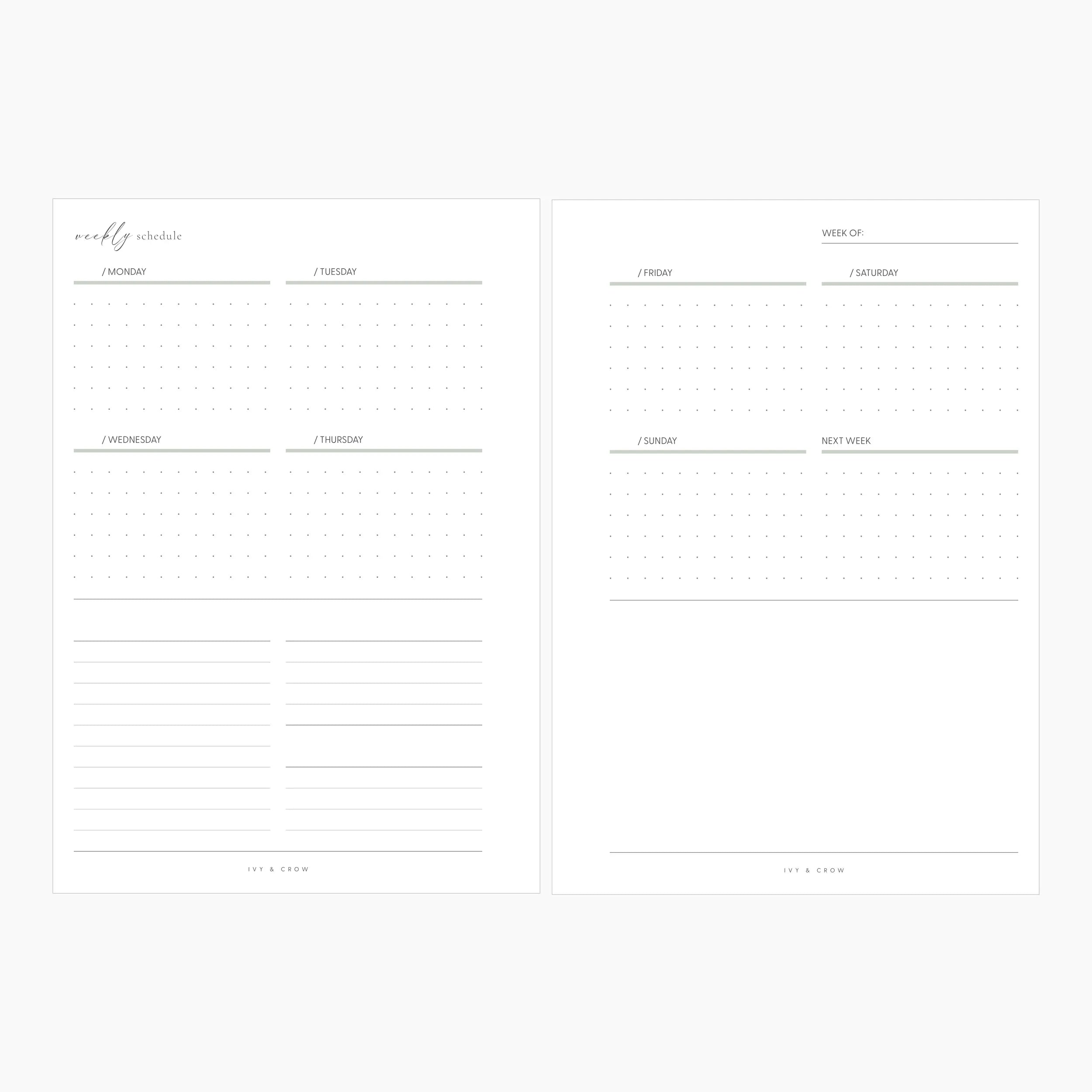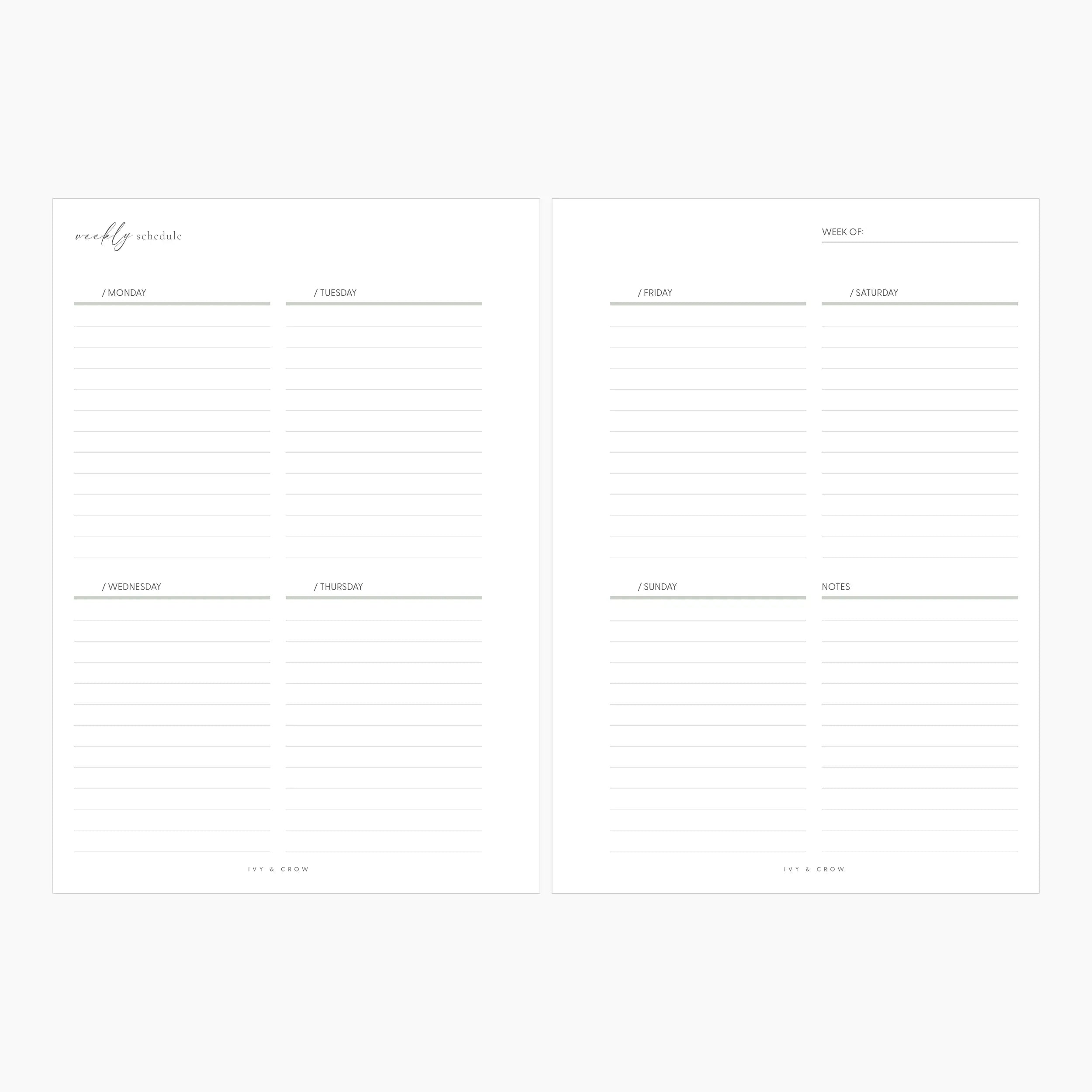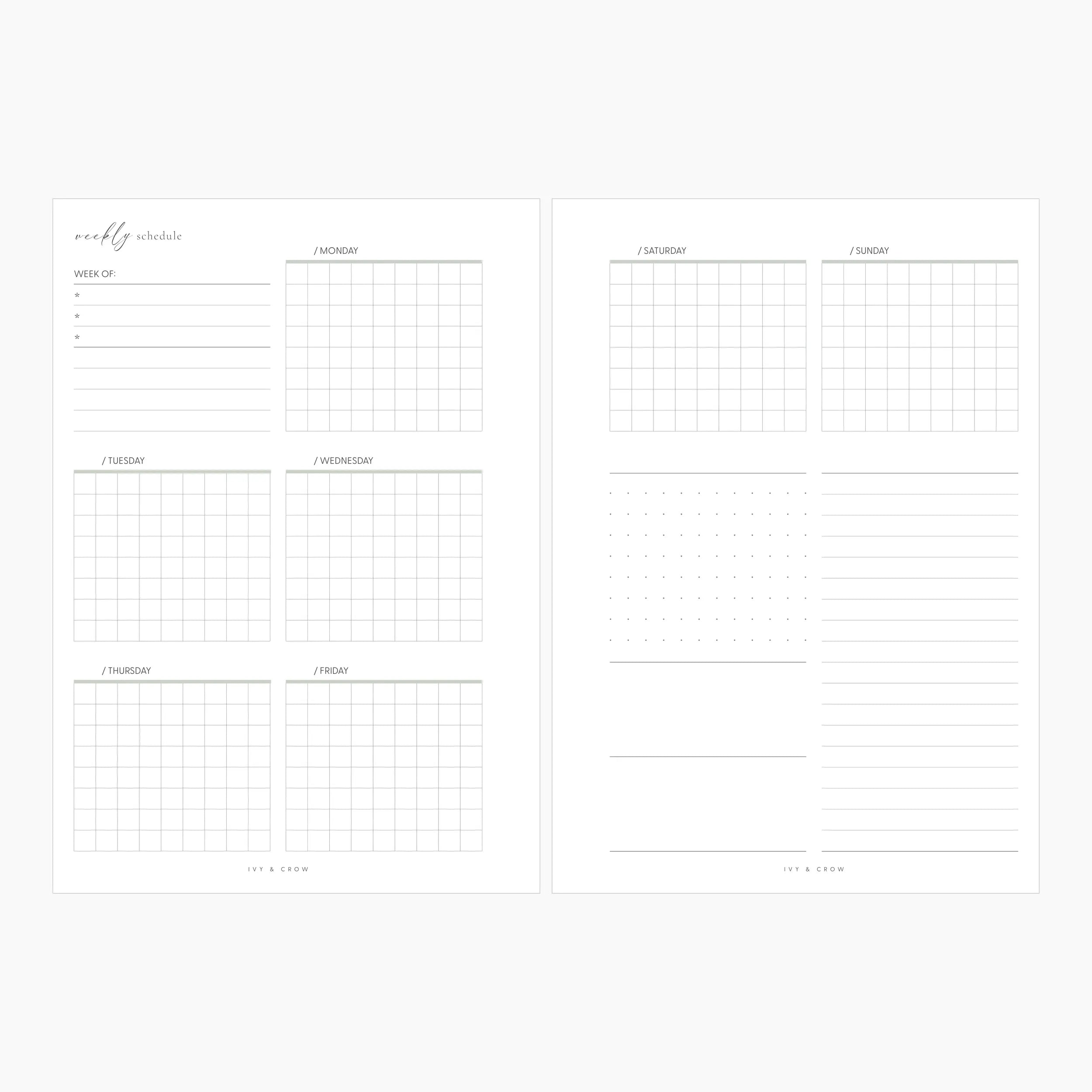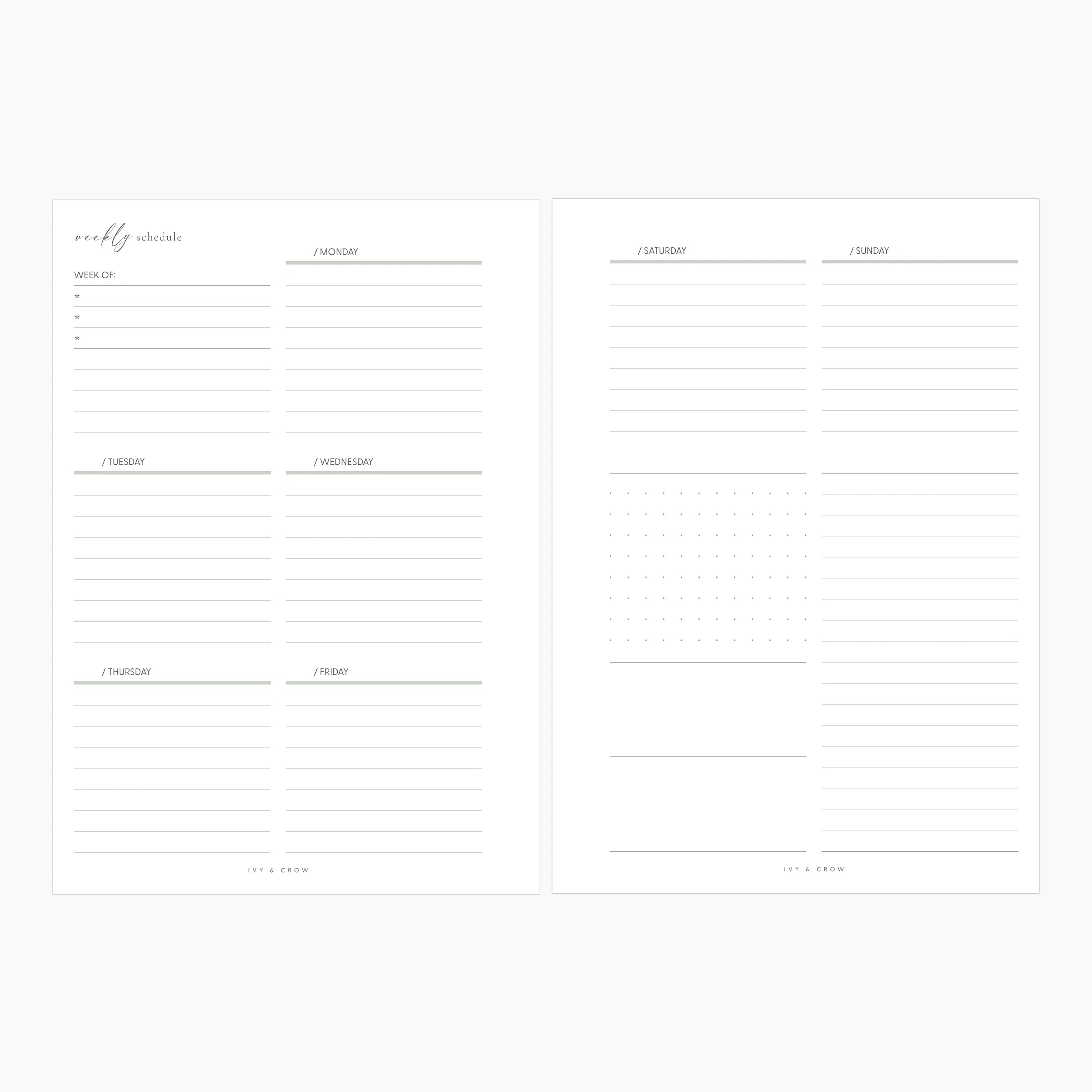 These undated weekly inserts can be printed back to back or separately and paired with our Weekly Organization and Personal Care inserts.