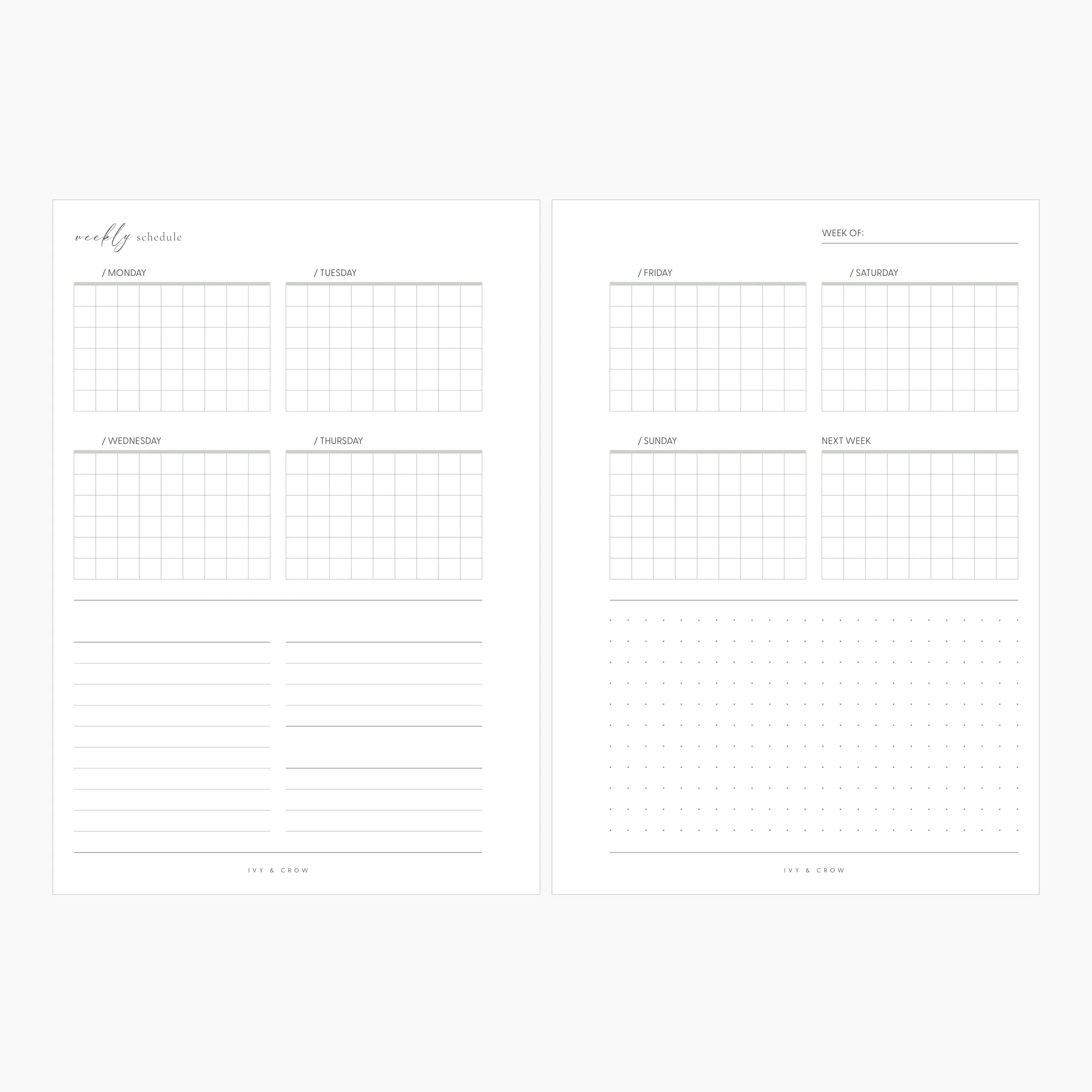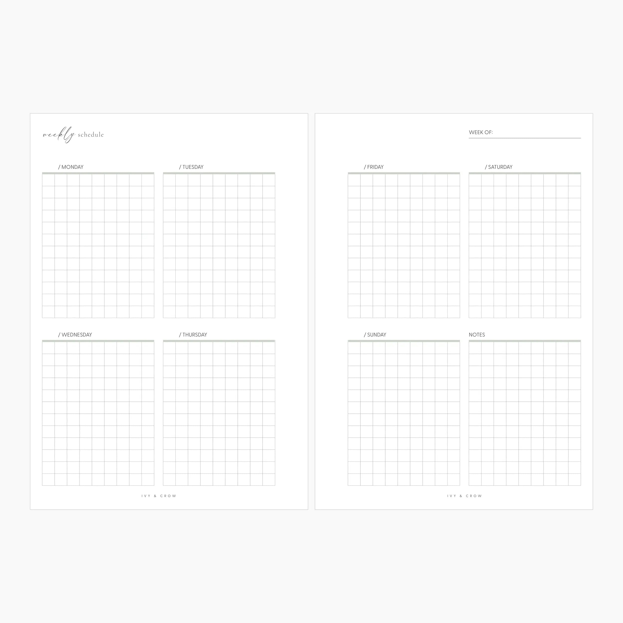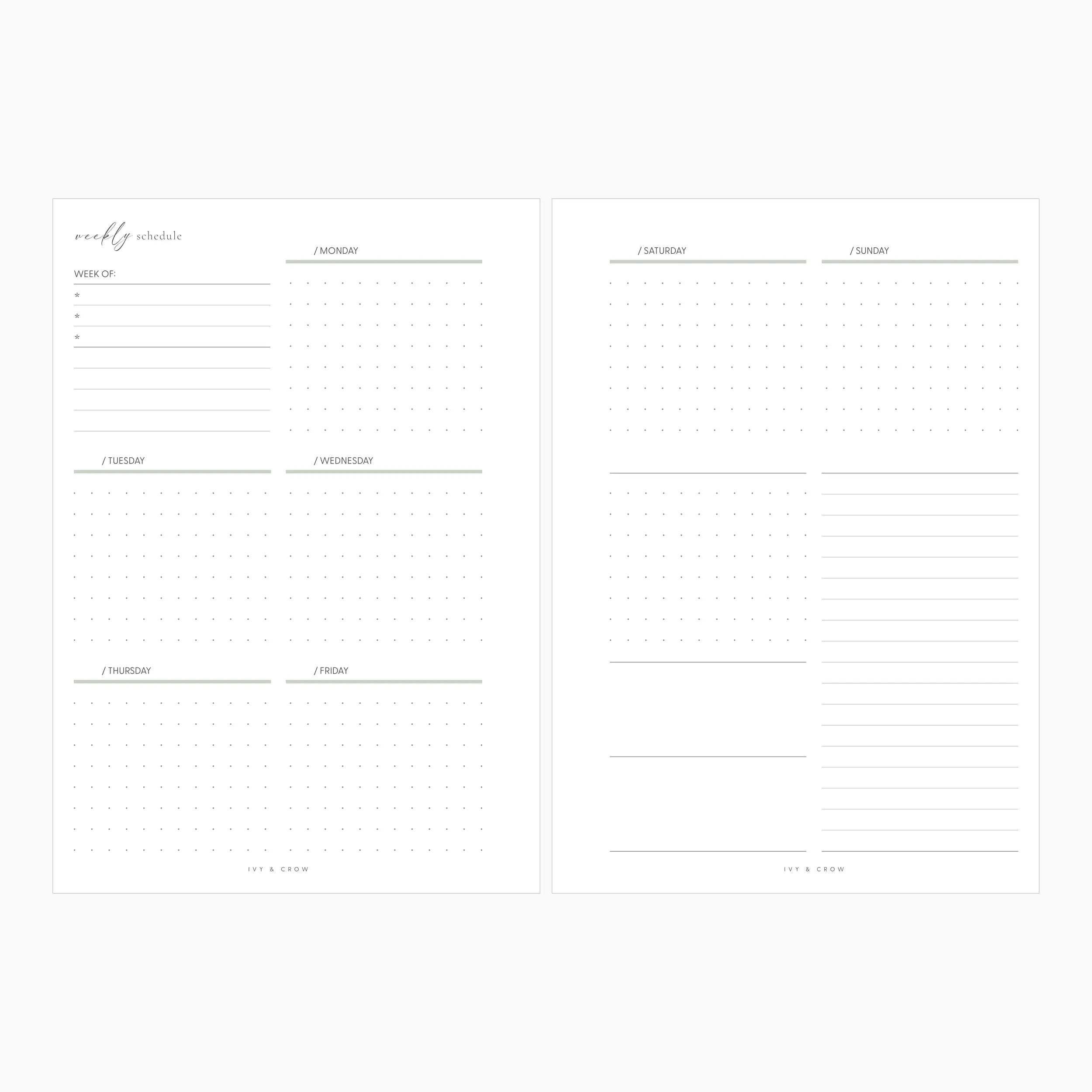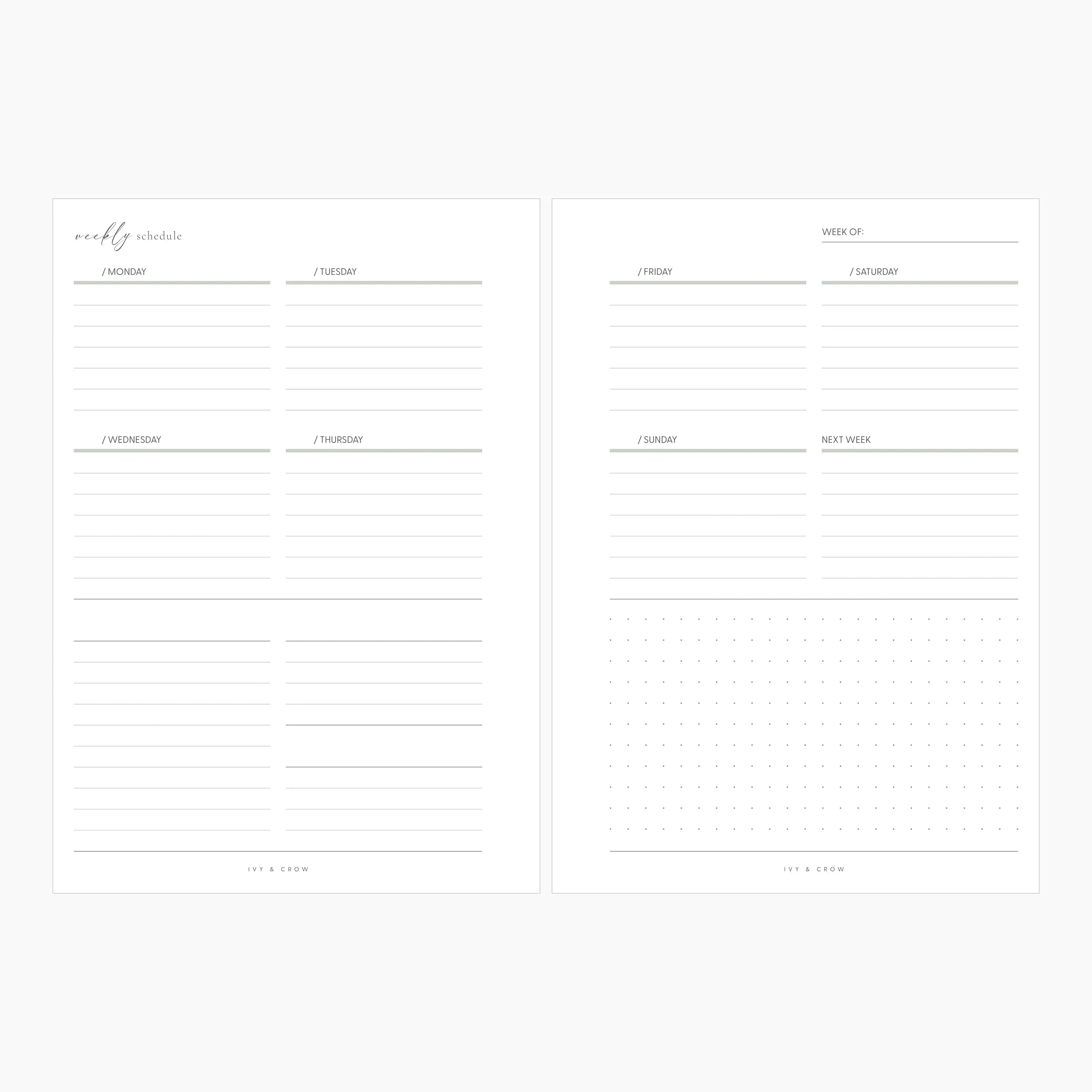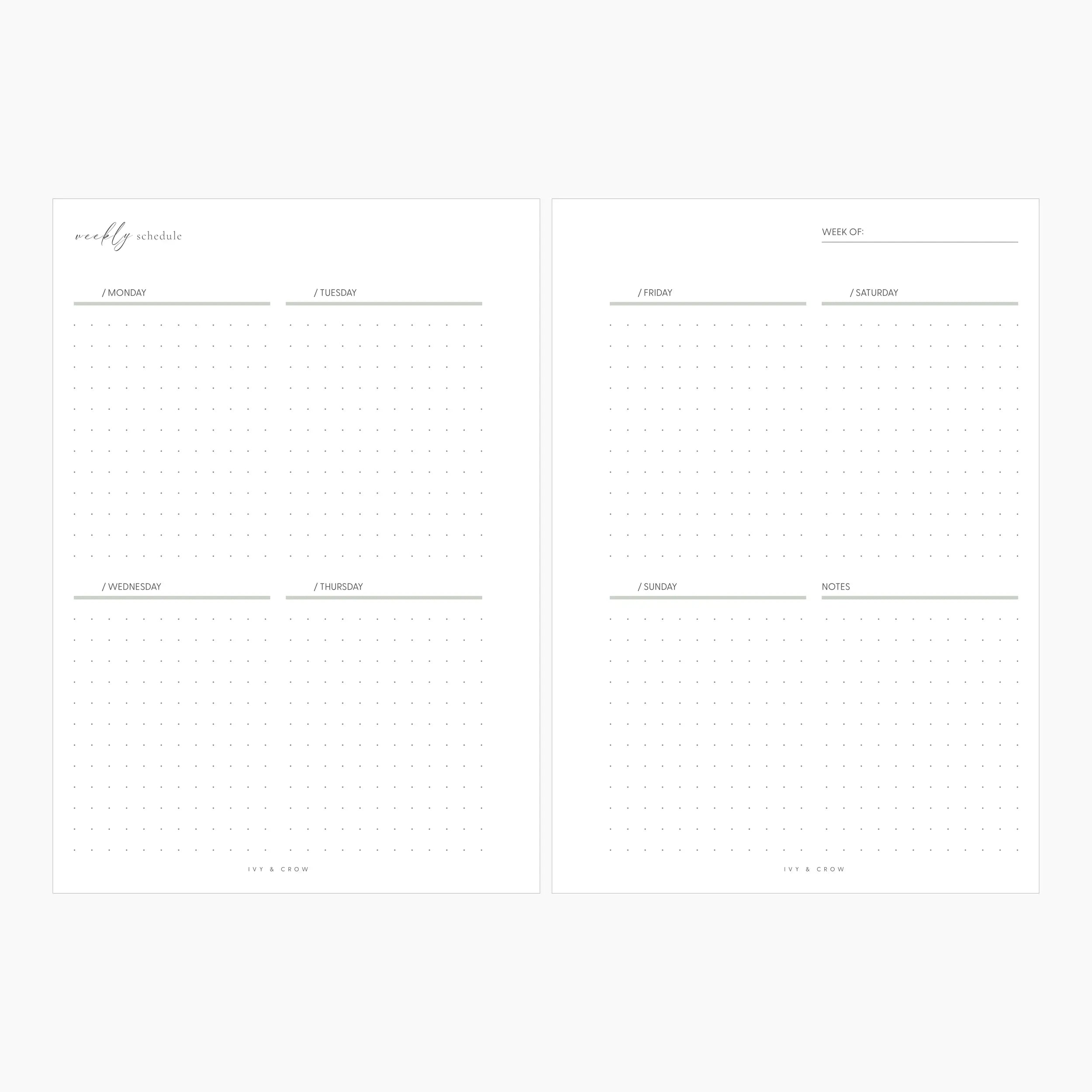 These undated weekly inserts can be printed back to back or separately and paired with our Weekly Organization and Personal Care inserts.